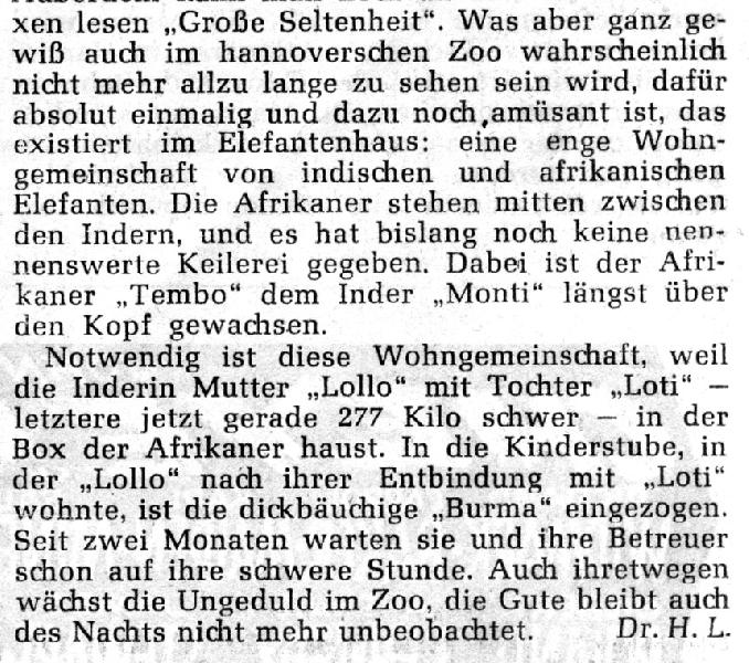 | Michael Mettler: | Schon mal "unbebildert" vorab: Das Buch "Unser Zoo" (großformatig, aber mit 72 Seiten recht dünn) enthält kein Herausgebedatum, dieses ist nur aus den Angaben der Zoo-Chroniken zu rekonstruieren. Die Texte wurden von verschiedenen Autoren verfasst, der erste vom damaligen Zoodirektor Otto Müller; herausgegeben wurde das Werk vom Zoologischen Garten der Stadt Hannover, erschienen ist es im Verlag Neuzeitliche Architektur A. Kosmala, Düsseldorf. Einer der Texte entspricht im Grunde einem (gut illustrierten) Zooführer. Abgebildet sind u.a. je ein jugendlicher Afrikanischer und (männlicher) Asiatischer Elefant, wobei weder Bildunterschriften noch Kapiteltext Angaben über Namen usw. enthalten und ich auch nicht meine Hand dafür ins Feuer legen würde, dass es sich um die tatsächlich zu dieser Zeit vorhandenen Individuen handelt (was natürlich auch für andere Fotos des Buches gilt). Beim Asiaten ist dies aber relativ wahrscheinlich, und dann müsste es Omar gewesen sein. (15.12.2016, 09:23) | ||