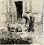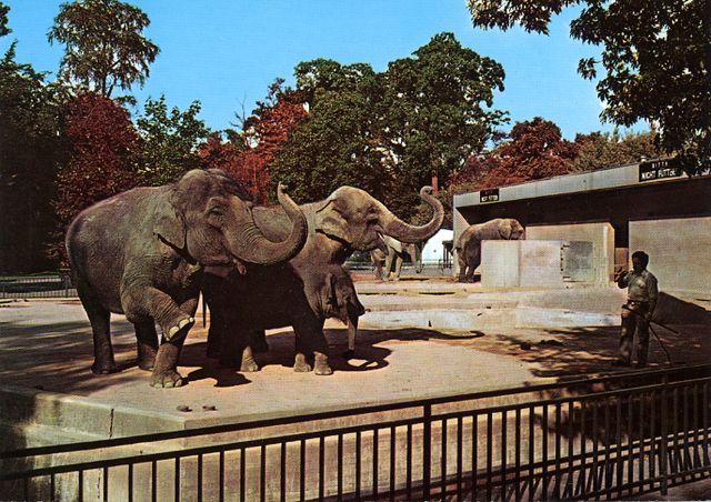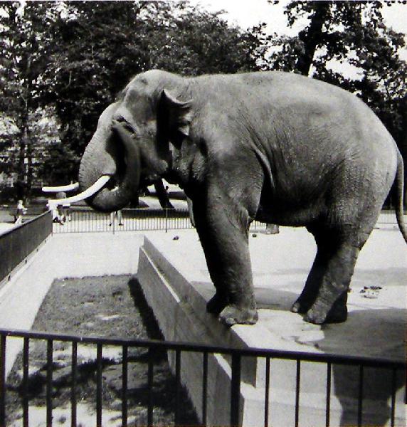 | Michael Mettler: | Mahari (später bis zu ihrem Tod in Basel, dort Mutter von Pambo). Auf diesem Bild ist zu sehen, dass die Außenanlage weitgehend gepflastert war, aber vor dem Haus eine Sandfläche enthielt. Hinter Maharis Schulter ist die Scheuersäule erkennbar, im Hintergrund erkennt man deren Gegenstück auf der Asiatenanlage. Die frei stehenden Betonwände vor der Hauswand boten eine Fluchtmöglichkeit für den Pfleger im Falle eines Angriffs in Hausnähe. In anderen Teilen der Gehege half in diesem Fall nur ein Sprung in den allseits auf relativ kurzem Weg erreichbaren Graben. Die regelmäßige Fütterung der Elefanten mit Astwerk war schon damals Standard in Hannover. (18.09.2015, 07:52) | ||
