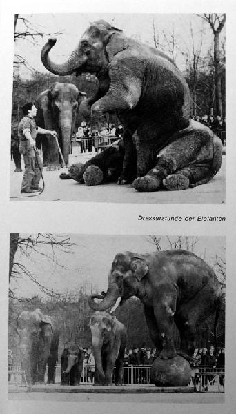 | Michael Mettler: | Im ZF von 1971 ist nicht nur das Bild von Mohti im Hochstand enthalten, sondern auch die hier abgebildete Seite mit anderen Dressurfotos. Auf dem oberen dürfte Mohti der liegende Elefant zu sein, denn ich meine da ein Stück Stoßzahn zu erkennen. Die sitzende Kuh ist jedenfalls Mapalay. Das untere Foto zeigt Mohti bei seinem Kugellauf, mit dem er sowohl auf der Freianlage als auch im Haus vorgeführt wurde, sowie im Hintergrund links Burma und rechts Mapalay. Keine Ahnung, wann das Bild aufgenommen wurde und um welches Kalb es sich handelt. Auch die Kuh hinter dem Kalb auf dem zuerst eingestellten Foto dürfte Mapalay sein. (22.03.2015, 19:20) | ||