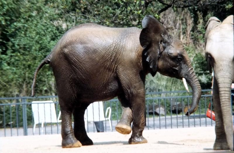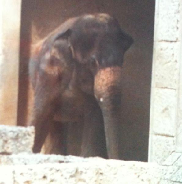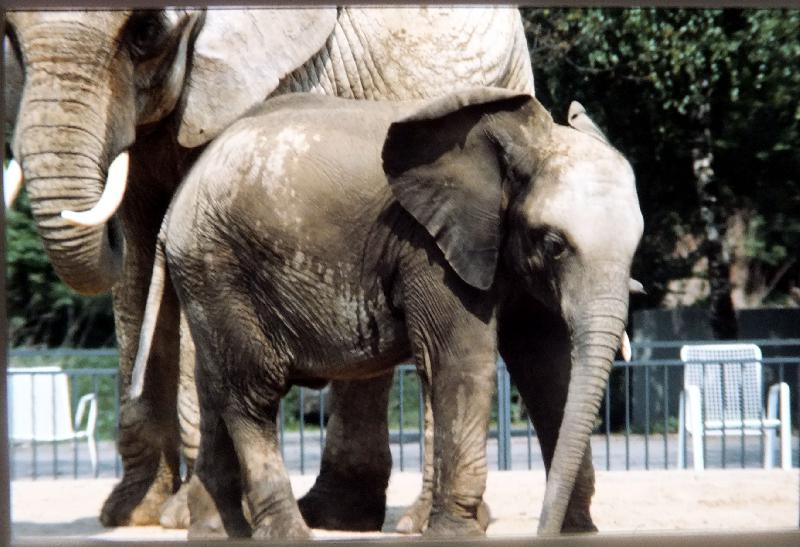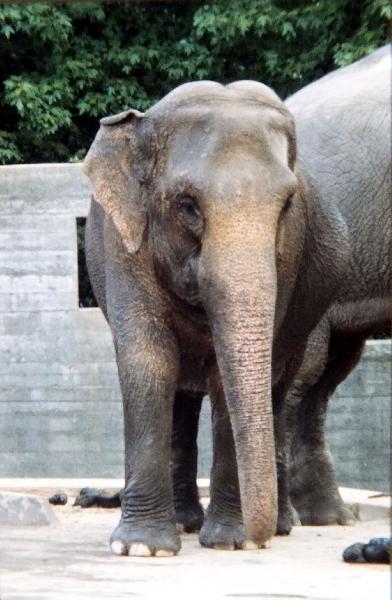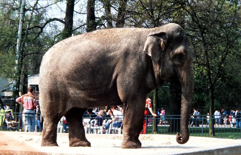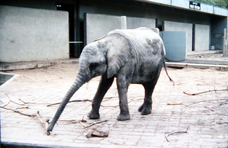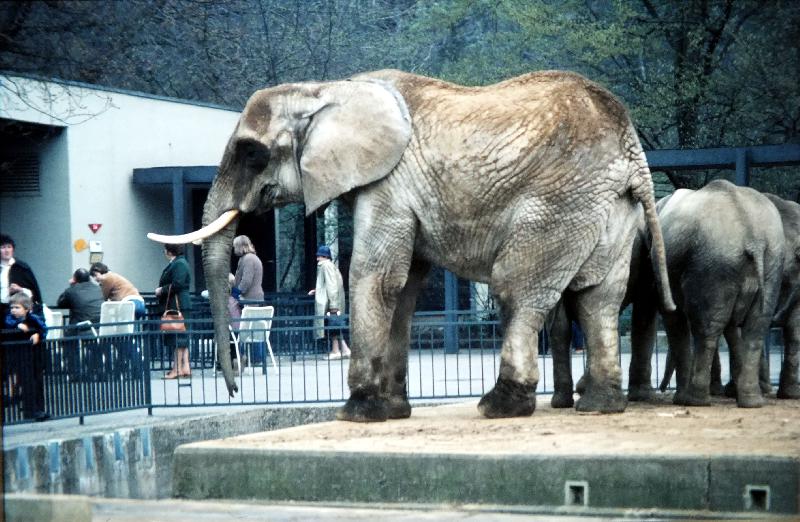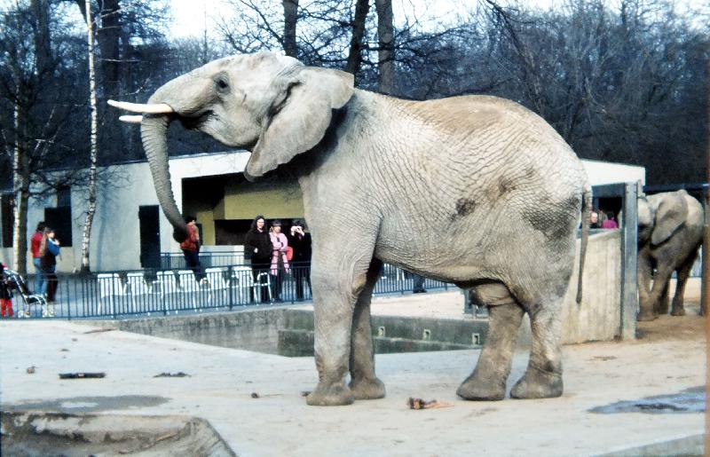 | Michael Mettler: | Ilona (damals meistens Lona genannt) 1983, kurz nach ihrer Ankunft. Sie kam "in voller Bemalung" aus dem Circus in den Zoo und ließ sich nicht auf einen Sitz davon reinigen, ausbleichende Reste dieser Dekoration waren deshalb noch sehr lange an ihr zu erkennen. Merke jetzt erst, dass ich kein altes Foto der ebenfalls 1983 eingetroffenen Jenny rausgesucht habe. Das schiebe ich nach, ebenso die Afrikaner. (17.09.2015, 08:57) | ||