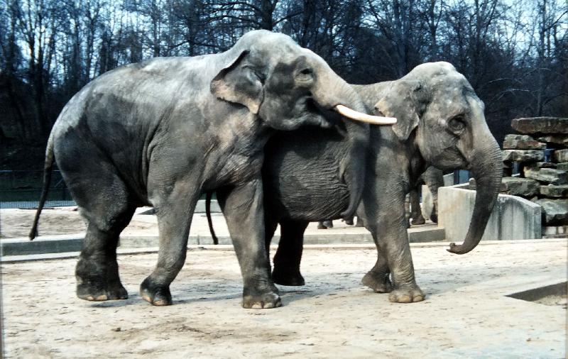 | Michael Mettler: | Yhetoo steht auf dem Foto übrigens auf der vormaligen Afrikaner-Erweiterungsfläche, zu dieser Zeit gab es keine Afrikaner mehr in Hannover und meiner Erinnerung nach waren die Gehege miteinander verbunden worden (und die letzte Afrikanerin Bibi wurde bis zu ihrer Abgabe 1993 mit den Asiaten zusammen gehalten). Wie angekündigt hier auch noch ein Foto von Jenny. Zur Abwechslung kein "Normalbild" - vielleicht war das sogar der Deckakt, der zu Jennys Trächtigkeit führte....? Aufgenommen quer über die Afrikaner-Anlage hinweg, rechts im Bild Indra, hinter den Elefanten ist der damalige Kiosk zu sehen. Die Kuppel hinter den Bäumen gehört zur hannoverschen Stadthalle. (18.09.2015, 20:58) | ||