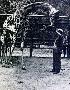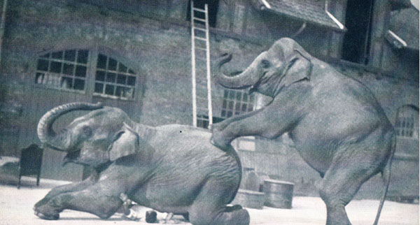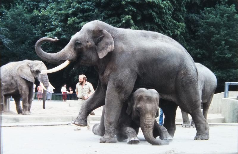 | Michael Mettler: | Siporex und Indra bei einer der damals regelmäßigen Dressurvorführungen. Der Bulle steigt hier nicht etwa über die liegende Kuh hinweg, sondern Indra robbt unter Siporex' Bauch hindurch. Mit im Bild der damalige Elefanten-Chefpfleger Rolf Amelung und jenseits des Grabens der Afrikanerbulle Kenny. (17.09.2015, 08:51) | ||