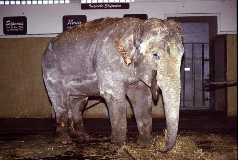 | Michael Mettler: | Das kann zu dieser Zeit nur Ilona gewesen sein. Allerdings wirkt Jenny hier auf den ersten Blick kleiner als sie war: Der höchste Punkt ihres Rückens ist von Siporex' Rüssel abgedeckt. Und Indra war natürlich noch nicht ausgewachsen. Bevor Siporex später seinen Bullenstall an der rechten Stallseite (bis dahin Afrikaner-Seite) bekam, war er im Stall ganz links außen angekettet. Auf einer anderen Aufnahme von Ilona im Stall, die 1987 entstand, ist links neben ihrem Schild das von Siporex zu sehen, also war sie zu dieser Zeit seine unmittelbare Stallnachbarin. (19.09.2015, 20:30) | ||