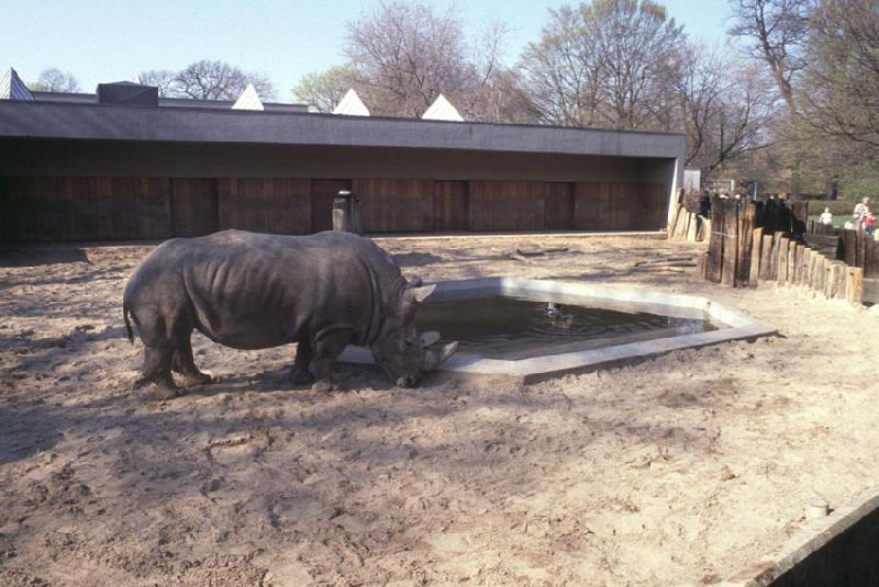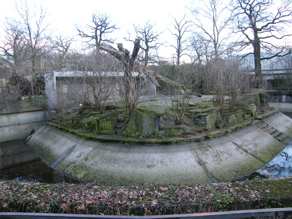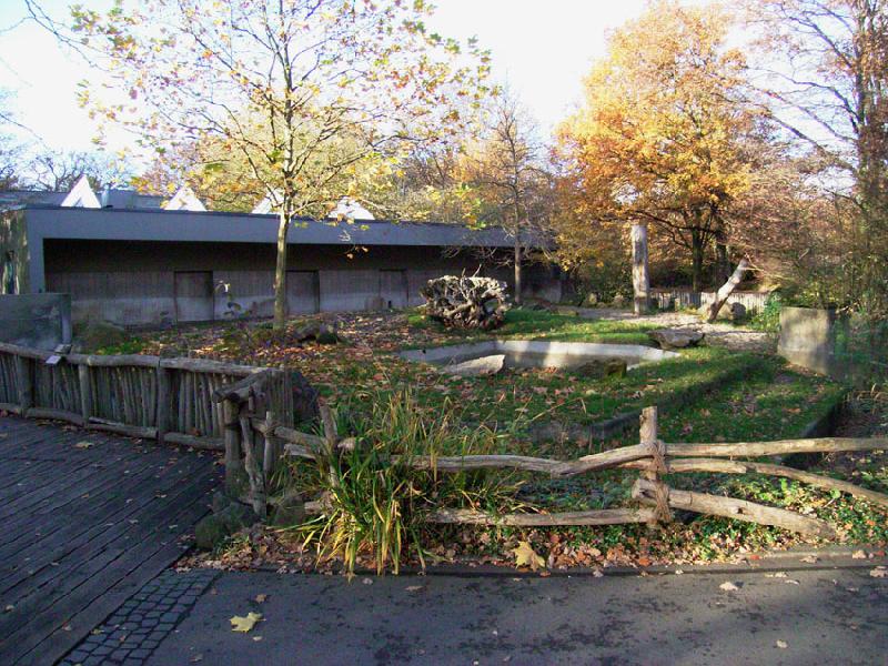 | Michael Mettler: | Die ehemalige (im Originalzustand noch durch einen Graben geteilte) Nashornanlage, nach dem Umzug der Spitzmaulnashörner an den Sambesi in der hier gezeigten Gestaltung für Flachlandtapire (zeitweilig in Vergesellschaftung mit Wasserschweinen und Dunkelrückenagutis) genutzt. Das Foto ist vom November 2007, also kurz vor Abriss. (15.12.2016, 19:07) | ||