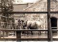 | Michael Mettler: | Und zum Schluss der Afrikaner der Bulle Kenny (Wildfang aus Uganda), der später noch vor Heri und Mahari (Wildfänge aus Südafrika) nach Basel abgegeben und dort Vater von Pambo wurde. Er steht hier auf dem Erweiterungsteil der Anlage, der mit dem alten Teil durch eine feste Brücke über den Trenngraben verbunden war, die als eine Schleuse beiderseits mit Toren verschlossen werden konnte (Durchgang rechts im Bild erkennbar - rechts außerhalb des Bildrandes befände sich der schon erwähnte Klippschliefer-Felshaufen). Wie gesagt nur eine Brücke, ein Rundlauf war also nicht möglich. Das Erweiterungsgehege enthielt im Gegensatz zum alten Gehegeteil ein Badebecken und anfangs auch einen großen Baum, der später entfernt werden musste (vermutlich hat er die Bodenverdichtung durch Baufahrzeuge und Elefanten nicht vertragen). Im Hintergrund wiederum das alte Flusspferdhaus. (18.09.2015, 08:41) | ||