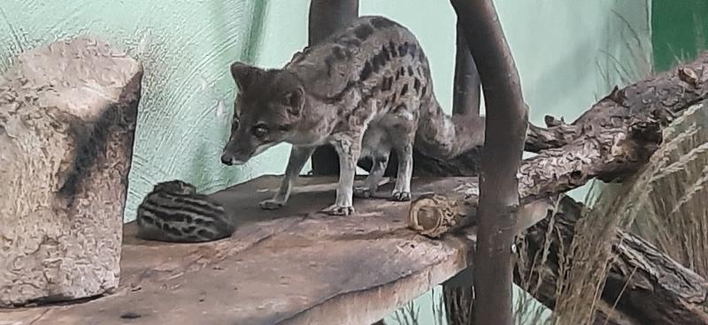 | Adrian Langer: | Gestern ging es dann zunächst nach Neunkirchen. Oberstes Ziel war die Sichtung der Fanalokas (mit zweimaligem Erfolg aber am Ende des Beitrags mehr dazu). In der Einrichtung selbst wird gerade ziemlich viel gebaut. So waren Bautätigkeiten an der Biberanlage zu sehen und das ehemalige Seehundbecken soll für Brillenpinguine umgebaut werden. Zudem soll nach dem Ableben des letzten Braunbären diese Anlage den Löwen zugeschlagen werden. Im Zoo selbst entstanden in den letzten Jahren einige neue Anlagen. So etwa die neue Hyänenanlage und eine zweiteilige Asienvoliere für Weißhaubenhäherling und Elliotfasan links und eine Voliere mit Pater-David-Hörnchen, Chinesischen Baumstreifenhörnchen und einer Taubenart rechts. Im Zoo selbst wechseln sich neue Anlagen mit alten teils umgenutzten und ausgebauten alten Anlagen ab. Ich bin gespannt, ob zukünftig weiter so viele Altanlagen im Bestand bleiben werden. Etwas suspekt empfand ich die Greifvogelhaltung, die mich im Aufbau an die im Zoo Jihlava erinnert hat. Hier ist glaube auch einiger Umbaubedarf vorhanden. Im Zoo selbst sind einige Raritäten zu finden. Neben Ostafrikanischer Hyäne und Borneo-Taubwaran sind auch Fanalokas und Europäische Zwergadler im Bestand (beides für mich Neusichtungen). Und wie versprochen! In der letzten Woche wurde eine Fanaloka geboren. Der Zoo selbst möchte mit einer Ankündigung noch warten und hofft, dass dieses Tier überlebt! Drücken wir die Daumen, dass es klappt! Anbei Fanaloka mit Nachwuchs. (01.06.2023, 08:17) | ||