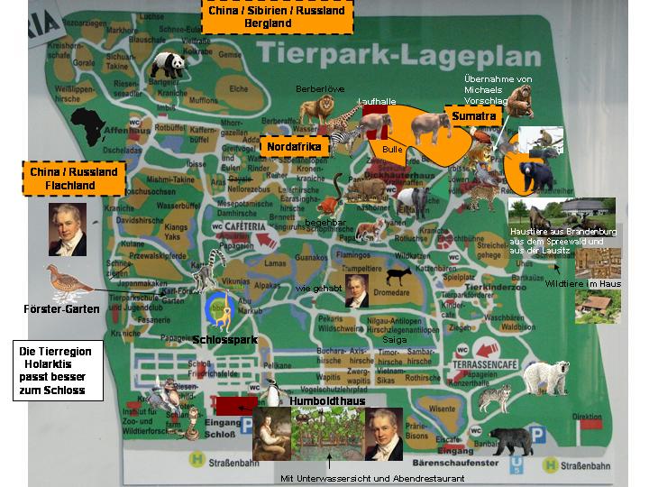 | Oskar Schwitters: | Da mein aktueller Hagenbeck-Masterplan noch eine Weile braucht und wir sowieso gerade über den Zoo Berlin diskutiert haben, hier nun mein Masterplan für den Zoo Berlin: Im Erdgeschoss des Aquariums sollten nur noch Süßwasserfische leben, die meisten Becken werden miteinander verbunden, um Lebensräume in größeren Becken präsentieren zu können. In der Krokodilhalle sollten beide Becken miteinander verbunden werden. In dem großen Gehege sollte eine bedrohte Krokodilform leben. Der Rest des Aquariums sollte für bedrohte Amphibien und Wirbellose genutzt werden. Da nun die meisten Reptilien und Meeresfische fehlen entsteht in Richtung der Anlage der Rappenantilopen ein Anbau. Im Erdgeschoss liegt ein zentrales Großbecken für Meeresschildkröten, sowie Haie und weitere Großfische. Drumherum gruppieren sich weitere Aquarien unter anderem ein großes Korallenriff. Highlight für Zoofans wären Seeschlangen und eine Abteilung für Tiefseetiere, wie Chimären und Nautilus, interessant wäre auch ein Import von Quastenflossern oder weiteren Tiefseearten, die derzeit nicht gezeigt werden. In den Stockwerken darüber gibt es Reptilien (Komodowarane als neue Attraktion), eine große Mangroven-Anlage, Schmetterlinge und Termiten. Statt den Hirschziegenantilopen entsteht ein Biodiversitätszentrum mit einigen bedrohten Kleintieren, Ausstellungen zu Evolution und Tierschmuggel, sowie der aktuellen EAZA-Kampagne und ein Raum für Wechselausstellungen. Der Wassergraben der Löwen-Freianlage wird zugeschüttet. Die Anlage wird in Anlagen für Afrikanische Wildhunde, Schabrackenhyänen, sowie eine Gemeinschaftsanlage für Erdwölfe, Erdferkel und natürlich Erdmännchen unterteilt. Die Tiger-Freianlage wird für Rothunde genutzt. Der Rest des Hauses gehört allein den Kleinkatzen. Das Nachttierhaus verschwindet, stattdessen entstehen in der Innenhalle zweigeschossige Innengehege für weitere Kleinkatzen, die auf dem Dach Außenanlagen erhalten. Der Grottenteich wird zugeschüttet. Hier entsteht stattdessen ein mehrgeschossiges Haus für Kleinraubtiere. Von Etage zu Etage wird es nach oben hin immer kleiner, auf dem freien Stück des Daches der letzten Etage entstehen jeweils die Außenanlagen. Der Neptunteich erfährt dasselbe Schicksal. Hier entsteht ein genauso geartetes Haus für weitere Kleinsäuger, vor allem Nagetiere. Im Keller entsteht ein Nachttierhaus, dessen Tag-Nachtrythmus allerdings nur um sechs Stunden verschoben ist, sodass die Tiere am Vormittag, wenn es drinnen noch hell ist, auch ihre Außenanlagen nutzen können. Die benachbarte Antilopen-Anlage erhält einen größeren Stall. Die Anlagen für Okapis und Bongos am Erdhaus weichen dem neuen Spielplatz mit Streichelzoo. Die benachbarte Nashorn-Anlage verschwindet um Platz für Eulen und Kraniche zu schaffen. Von Ameisenbären bis Nashornhaus entsteht ein Haus für Tiere Neuseelands (Kea, Kiwi, Brückenechse, nach Möglichkeit auch Neuimporte wie Eulenpapageien und Gelbaugenpinguine). Auf dem Erweiterungsgelände entsteht ein Dickhäuterhaus für Asiatische Elefanten, Spitzmaulnashörner, Schabrackentapire, Baird-Tapire, Hirscheber und Schliefer. Der Platz sollte auch noch für Panzernashörner reichen. Neuimporte von Berg- oder Kabomani-Tapiren wären interessant. Am Persischen Pferdeturm entsteht ein großes Innengehege auf der Fläche Säbelantilopen. Die anderen Anlagen werden für Säbelantilopen oder Arabische Oryx, Nordafrikanische Strauße, Rothalsgazellen und Grevy-Zebras oder Somali-Wildesel genutzt. Im anderen Zebrahaus leben Onager, nach Möglichkeit in Gemeinschaftshaltung mit Streifenhyänen oder Arabischen Oryx und Arabischen Tharen. Die Anlage der Zwergotter wird mit dem derzeit nicht genutzten Robbenbecken verbunden und für Seeotter genutzt. Die restlichen Robbenbecken werden miteinander verbunden und vertieft. Sie werden mit Walrossen in Gemeinschaftshaltung mit Stellerschen Seelöwen und Nördlichen Seebären besetzt. Das Pinguinhaus wird um die Biberanlage erweitert. Dann könnten auch weitere Arten (Zügel-, Adelie-und Eselspinguin) gehalten werden. Die Voliere der Kondore wird für Brillen- und Humboldtpinguine (in getrennten Anlagen) umgebaut. Der Luftraum wird von Seeschwalben genutzt. Die ganze Voliere ist begehbar (auch die Landteile der Pinguine). Das Sumpfvogelpanorama wird ähnlich umgebaut, nur für Seevögel des Nordens. Die Voliere ist landschaftlich unterteilt in Watt (Limikolen), Steilküste (Basstölpel, Papageitaucher) und Tundra (Gänse, Enten). Die Anlage der Nasenbären wird für Europäische Nerze umgebaut. Die Anlage der Afrikanischen Wildhunde wird für Kasuare und Baumkängurus umgebaut. Den Eisbären wird die Wolfsanlage zugeschlagen und sie werden mit Vielfraßen vergesellschaftet. Die Anlage des Kragenbären wird genutzt um die Zucht der Lippenbären auszubauen. Sie werden zusammen mit Bartaffen und Schakalen gehalten. Der Spielplatz wird von einer Anlage für eine Rentnergruppe Kragenbären, Hulmans und Kleinen Pandas abgelöst. Die Fasanerie wird aufgehübscht und auch an der Seite zum Landwehrkanal entstehen Volieren für Kleinvögel. Der Bestand der Freiflughallen im Vogelhaus wird um Kantschile in der Asien- und Geier, Klippschliefer und Kap-Borstenhörnchen in der Afrikahalle ergänzt. Die Haltung der Warzenschweine wird aufgegeben, ihre Anlage wird den Zwergflusspferden zugeschlagen. In der Innenanlage der Zwergflusspferde wird der Landteil über den Wasserteil erweitert. Sie werden mit Duckern vergesellschaftet. Der Landteil der Flusspferde wird ebenfalls erweitert und sie werden mit Ottern zusammen gehalten. Am Flusspferdhaus entsteht eine Voliere für Schuhschnäbel. Die Anlagen der Hochgebirgs-und Zwergflamingos, die Strandvogelvoliere und ein Teil des Kinderzoos wird zu einer begehbaren Anden-Großvoliere umgebaut, wobei die Grundstruktur der Strandvogelvoliere erhalten bleibt. Besatz (unter anderem): Südpudu, Andenkondor, Andenfelsenhahn, Jamesfla
