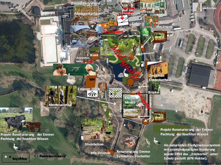 | Sascha Möller: | Meine Planungen für den Zoo Duisburg. Aufgrund der finanziellen Lage weiß ich, das diese vollkommen utopisch sind, aber man wird ja wohl noch träumen dürfen… Der Zoo wird zu einem GEO Zoo – mit wenigen Ausnahmen – umgebaut. Abgaben: Breitmaulnashorn, Polarwolf, Rentier, Schnee-Eule, Seehund, Kalifornischer Seelöwe, Dschelada und Unka (je nur noch ein Tier vorhanden), Chile-Flamingos Zugänge: Panzernashorn, Schabrakentapir, Weißbartgnu, Afrikanischer Seebär, Gürteltier, Königsgeier Aus dem bisherigen Giraffenhaus incl. Freianlage wird der neue Australienbereich. Die Außenanlage wird von den vorhandenen Emus, Bennettkängurus und Wombat genutzt. Das Giraffenhaus wird zu einem Australischen Busch umgebaut und die neue Heimat der Koalas, Baumkängurus, Kurzschnabeligel und Beutelrattenkängurus. Die Kookaburras werden Freiflieger. Der Madagaskarbereich (Lemureninsel und Fossas) sowie die Elefantenhaltung bleiben bestehen. Dies sind die Abweichungen vom Geokonzept. Die Elefantenhaltung wird noch einige Jahrzehnte laufen und soll dann in Duisburg nach meinen Planungen nach dem ableben der Tiere auslaufen. Vorbei an den Fossas beginnt der neue Bereich der einheimischen Tiere. Vorbei am bestehenden Amphibienteich entsteht gegenüber der neuen Luchs- und Wildkatzenanlage eine große Freianlage für die Wisent Zuchtgruppe. Das Raubtierhaus wird komplett abgerissen. Auf einem Teil des jetzigen Tapir Geheges entsteht vor Kopf eine große Voliere für die Uhus. Eine kleine Kurve und der große Afrikateil beginnt. Begrüßt durch die Zwergmangusten geht es zuerst durch die „Raubtiergasse“ mit Wildhunden auf der einen und Löwen auf der anderen Seite. Diese endet auf dem großen Afrika Platz vor dem Eingang des Giraffenhauses indem wie gehabt die Textorweber eine Voliere haben. Die Hornraben finden einen neuen Platz im Zoo. Gegenüber der bestehenden, nun vergrößerten Afrika-Lodge, den bestehenden Gehegen für Erdmännchen und Zebramangusten entsteht das neue Zentrum des Zoos, eine Wiederbelebung des „Afrikanum“. In einer großen Gemeinschaftsanlage leben hier die Netzgiraffen zusammen mit der Zebra- Zuchtgruppe und den großen Kudu Böcken. Neu hinzu in den Zoo und ein neues Alleinstellungsmerkmal in der Region: eine Herde Weißbartgnus. Das Afrikanum wird auf einem breiten Weg umrundet, vorbei an den Dik Diks und Trappen ist auf der ehemaligen, nun vergrößerten Vielfraß Anlage ein neues Gehege für die Watussi Rinder entstanden, die nun nicht mehr in Gemeinschaft der Pinselohrschweine leben. Hier kann sich der Besucher entscheiden, ob der links in den Afrikanischen Kongo oder rechts in die „Sparkassen Erlebniswelt abbiegt“. Letztere bleibt wie gehabt bestehen. Gehen wir also links, vorbei an einer Mandrill Schlucht und einer Voliere für Kongo Graupapageien erstreckt sich auf der Gegenüberliegenden Seite die Gemeinschaftsanlage der Gorilla Zuchtgruppe und Brazza Meerkatzen. Es folgt das neue Kongo Haus indem sich die Innenanlagen der Affen befinden. Ausgeleuchtet durch eine große Glaskuppel in der Dachmitte begegnen uns hier freifliegende Vögel (Turakos etc.). Verlasen wir das Kongo Haus auf der Gegenüberliegenden Seite, liegt links am Haus die Außenanlage der Bärenstummelaffen Zuchtgruppe. Geradeaus auf dem Gelände des ehemaligen Pinguin und Seelöwenanlage eine neue bewaldete Anlage für eine neue Bongo Zuchtgruppe und die Pinselohrschweine. Der Zugang zur Sparkassen Erlebniswelt, dem großen Spielplatz und Kiosk bleibt erhalten. Halten wir uns rechts erstrecken sich auf dem Weg zur Kreuzung Watussi/Mandrill/Sparkassen Erlebniswelt zwei übernetzte Außenanlagen für Zwergflusspferde. Auf der einen Anlage in Gemeinschaftshaltung mit den Roloway Meerkatzen, auf der anderen mit den Weißnasenmeerkatzen. Wieder zurück zur Afrika Lodge und Richtung Zooausgang bleibt der Hauptweg erhalten. Auf der nun linken Seite wurden die Käfige bzw. Anlagen der Gänsegeier, Uhus, Waldrapp sowie der obere Teil der Fasanerie abgerissen und durch einen, großen und hohen Freiflugkäfig für Großgreife ersetzt. Hier leben nun Gänsegeier, Marabus, Weißstörche, Südl. Hornraben, Waldrapp, Hammerkopf und Perlhühner zusammen. Auf der rechten Seite entsteht eine neue Anlage für Afrikanische Seebären incl. Unterwassertunnel. Die Anlage – die sicher zum Anziehungspunkt wird – ist von der gesamten Afrika Lodge aus gut einsehbar. Weiter unten , immer noch gegenüber der großen Afrikanischen Greifvoliere, entsteht eine begehbare Voliere für Brillenpinguine und Rötelpelikane (künftig nicht mehr gestutzt und somit in übernetzter Anlage). Hier leben künftig auch die Kaptriele.Vom Besucherweg aus ist die Einsicht unter Wasser gegeben. Nun beginnt der Südamerika Teil. Die beiden unteren Anlagen der Fasanerie werden abgerissen und ebenfalls durch einen hohen Freiflugkäfig ersetzt. Hier leben künftig Halsbandwehrvögel und Königsgeier in Gemeinschaft. Die Anlage der Brillenbären bleibt erhalten und wird durch Nasenbären wie geplant ergänzt. Gegenüber, auf der ehemaligen Wisent Anlage entsteht eine neue Anlage für Südamerikanische Tiere (Flachlandtapire, Ameisenbären, Nandus und Maras). An Stelle der jetzigen Nebelparderanlagen entsteht ein neues begehbares Warmhause für die Tapire und Ameisenbären. Tropisch bepflanzt wird es auch zur Heimat der Lisztäffchen-Zuchtgruppe und den Faultieren aus dem Äquatorium. Um den Südamerika Bereich abzuschließen: Aquarium und Rio Negro Halle bleiben erhalten, die Zwergotteranlage wird für Gürteltiere umgebaut und der jetzige große Weiher wird übernetzt, umgebaut und für Süd-Amerikanische Vögel gestaltet. Er wird begehbar sein und auf einer großen Insel finden die Goldenen Löwenäffchen eine neue Heimat. Besetzt wird die Anlage u.a. mit Kuba Flamingos, Roten Sichlern und diversen Enten. Vor Kopf - gegenüber dem Rio Negro Ausgang - entsteht ein Warmhaus für die Flamingos und die anderen Volieren Ti
