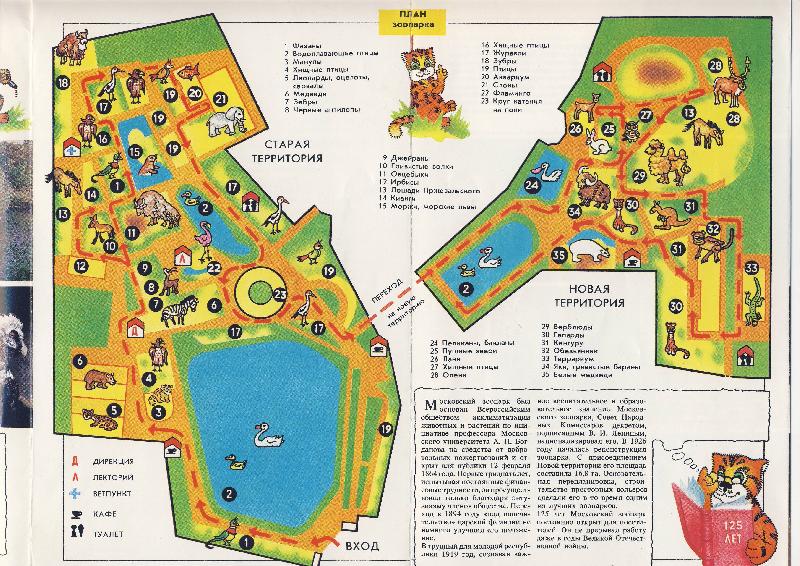 | WolfDrei: | Da der Thread Zoopläne heißt: hier also Moskau von 1991. Größenmäßig kann es seitdem keine Veränderung gegeben haben, da der Zoo umbaut ist. Die etwas verniedlichenden Zeichnungen mögem dem nichtkyrillisch Lesen-Könnenden ausreichen. Links das alte Gelände (Territorium genannt [1864 gegründet], links das neue [1926 16,8 ha dazugekommen]) Summarisch also gegen 40-45 ha Innenstadtbereich. 1991 gab es also noch den Übergang, keine Brücke, die ich dann 1994 überquerte. (11.10.2008, 18:52) | ||