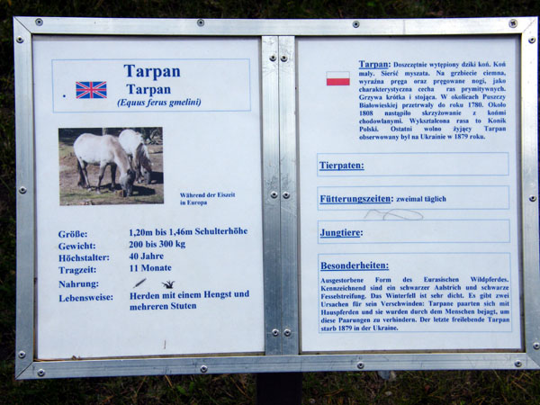 | Michael Mettler: | Fundstück aus Ueckermünde: Die Beschilderung erklärt den Tarpan für ausgestorben und enthält keinen Hinweis auf die "Rückzüchtung". Da darf sich der Besucher dann fragen, ob die im Gehege zu sehenden Tiere nur eine Halluzination sind :-) Gerade in einem Zoo mit vielen polnischen Besuchern würde sich doch der Hinweis auf die wichtige Rolle des Koniks bei der Züchtung der Heck-Tarpane anbieten. (23.09.2008, 16:10) | ||