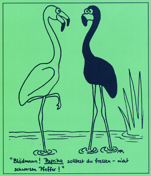 | Langhals: | Bei meinem letzten Besuch in Frankfurt sagte ein Vater zu seiner Familie zu den Roten Sichlern:"Schaut Mal, Flamingos."Und zu den in der gleichen Anlage untergebrachten Kahnschnäbeln" Und Marabus " (14.11.2006, 22:48) | ||