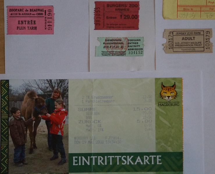 | WolfDrei: | “Gehen wir mal zu Hagenbeck” (wird dieses Lied noch gespielt?) - oder gehen wir einfach als Normalbesucher in irgendeinen Zoo. Vor ca 50 Jahren war das eine einfache Sache. An einer Holzbude angelangt, bekam man für maximal 50 Pfennig von einer Rolle (grün oder rot) ein “Papierchen”. Solche Abrisskarten gab es für viele Veranstaltungen: Kino, Sportplatz u.a.. Manchmal stand da auch Eintritt oder 50 Pfennig drauf. Verbilligungen gab es kaum, was sollte auch billiger werden. Dafür gab es verbilligte Tage. Das Geld der Kassiererin lag in einer offenen Kassette. Anschließend machte der Kontrolleur oder die Kassiererin selbst einen kleinen Riss in die Karte, fertig. Man wurde noch ermahnt, die Karte ja für eine etwaige Kontrolle am Mann zu haben, speziell, wenn man, von außen sichtbar, einen Fotoapparat hatte und demzufolge eine Fotokarte haben musste (die letzte erlebte ich noch vor nicht langer Zeit in Rostock). Heute, wo jeder “Fotokünstler” mit dem Handy, dem iPod etc. herumrennt, wäre das natürlich nicht überprüfbar, höchstens, da es noch einige Besitzer “richtiger” Fotoapparate gibt. In Moskau musste man vor 40 Jahren die Karte tunlichst aufbewahren, da es einen alten (jetzt 150 Jahre alt) und einen neuen Zoo (nur 90 Jahre alt) gibt, getrennt durch die Große Grusinskaja -Straße (neue Kontrolle also). Heute führt eine pompöse Steinbrücke über die Straße . Gegenwärtig ist nun der Zoo-Zutritt weitaus komplexer. Weshalb dieser Einstieg? Meine Frau hatte mich angehalten, aufzuräumen. Da fiel mir in der untersten Lade ein Kiste in die Hand mit den Zoo-Eintrittskarten der letzten 20 Jahre. Nicht vollständig, gerade jene aus ausländischen Zoos sind verlustig gegangen oder liegen noch in Extratüten. Und es war ein Erlebnis, alle gesammelten Karten zu sortieren, aufzukleben und dazu zu philosophieren! Die Preisgestaltung deutscher Zoos wurde ja schon im “Tiergarten” behandelt, soll hier keine Rolle spielen. Man kommt also an: per Bahn, Bus, Tram, U-Bahn, S-Bahn oder auch zu Fuß (eine Frau am Bahnhof von Port Lympne: was, 5 Meilen wollen sie laufen? Der Zoo Howletts hatte nun inzwischen einen Zubringerbus vom Bahnhof Bekesbourne). Oder mit dem Auto: manchmal freies Parken, manchmal ganz günstig - oder so, dass man in der verbilligten Parkzeit den Zoo nie schaffte und es dann richtig teuer wurde (in Dresden einstmals nach 2 Stunden). In Apenheul musste man für den Parkplatz die Bezahlung an der Kasse machen, der Weg war weit, so man die Hinweise nicht las oder nicht verstand. Heute spricht ja jeder englisch. So bringe ich es mittlerweile in 10 europäischen Sprachen fertig zu fragen: wo geht es zum Zoo? Und was ist? In Paris, 100 m vor dem Eingang von Vincennes: wissen wir nicht. Dann steht man trotzdem vor der Kasse und studiert die Preise - das ist mindestens so kompliziert wie das Studium der Bahntarife! Meistens gehen die Rentner leer aus (positiv Cottbus, Johannesburg, ehemals Planckendael). Und Prag! Meinen Rentnerausweis vorzeigend, sagt die Kassiererin: Sie sind ja schon über ---alt (sag ich nicht), bitte 1 Krone (waren so 5 Cent), Normalpreis 150 Kronen Aber Köln, Hagenbeck, Hannover? Nix da! Dann bekommt man also die Eintrittskarte. Eintrittskarten! Aber welche Fülle der Formen und Größen! Gewonnen hat im unteren Größensegment Planckendael: ein Stück Papier, 2 x 5 cm! Es folgen dichtauf Jersey, Arnheim und Zürich. Aber das war kurz nach dem Fall der Mauer - vor 24 Jahren! Mein Gott. Heute sind Eintrittskarten offensichtlich Werbematerial, gesponsert fast immer - mit deutlicher Ausweisung des Sponsors. Vorderseitig natürlich Tiere: gerade Geborene, Seltene, Berühmte. Manchmal ist sogar der Zooplan zu erkennen. Zwischenzeitlich gab es dann an der Kasse gedruckte Tickets von der Papierrolle wie beim Kauf im Lebensmittel-Shop. Ein langer Zettel mit dem Preis, der Geldnote, dem Rückgeld, noch vielleicht dem Logo - und: Danke! besuchen sie uns wieder. Gerade aus den Zoos des Ruhrgebietes habe ich eine Menge davon. Und häufig wird geworben, dass diese Karte schon der erste Schritt zur Jahreskarte sein könnte - und sie wird natürlich angerechnet! (speziell in den USA; in San Diego war das schon ein Drittel des Jahreskartenpreises, Mitglieder des Freundeskreises (member) haben dort sogar eigene Eingänge!) Dann die Verbundzoos: da sie uns besuchen, können sie verbilligt in den Zoo X,Y und Z hineinkommen. Mit der Karte von Eberswalde kann man z.B. in einem McDonald 30 Cent sparen, verbilligt Sea Life Berlin besuchen - oder ähnliches. In allen Tourismuszentren liegen Reklamekärtchen und versprechen einen verbilligten Besuch (aber nicht gegen Auszahlung oder addiert durch Einsammeln größerer Mengen, bitteschön!). Und nun kommt noch das ONLINE-Geschäft: digitale Zoo-Eintritte, mit freier Fahrt zum Zoo sogar oder/ und Verbilligung. Ein Erlebnis: in Beauval (St. Aignan) waren gerade die Pandas eingetroffen. Auch noch ein Sonntag, größter Andrang in einer Riesenschlange kurz vor 9 Uhr, aber daneben auch eine “Schlängelchen” von nur 3 m. Das waren die cash-Käufer (ich auch zum Glück), die Riesenschlange waren die “Elektronischen”. Noch interessant: in Beauval bekam man einen Stempel auf die Handoberfläche (theoretisch abwaschbar), nach Wunsch auch in Doue: so man schnell mal zum Auto musste, etwas vergessen hatte etc. Aber weiter: Früher wurde die Karte angerissen, später ein Eckchen abgerissen, heute ist da ein Barcode, man wird exakt eingetaktet: Erwachsener, Jahreskarteninhaber, ermäßigt, Gruppe, kleiner als 1,20 etc.(Beijing ehemals - freier Zutritt). Das ist wichtig für den Wettbewerb der Zoos untereinander! Dann wird oft die Postleitzahl erfragt - Herkunftsforschung! Bei einem Normaleintritt im Tierpark Berlin von 12 Euro und einer Million Besucher ergibt sich über alle Ermässigungsarten pro Besucher nur ein Gewinn von 4,32 Euro (haben die Förderer errechnet). Ich will gar nicht den Faktor 20 de