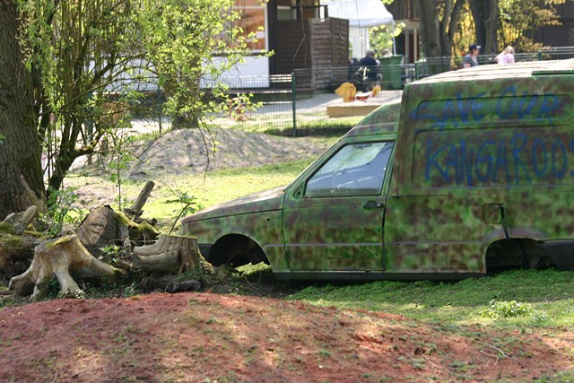 | Holger Schucht: | Die Dingos leben zur Zeit in einem abgesperrten Bereich bei den Japanmakaken, sollen aber ein neues Gehege im Bärenwald erhalten. Dort soll dieses Jahr auch noch ein neues Gehege für Luchse entstehen. Wenn die Gehege für Dingos und Luchse fertig sind soll dann das Tigergehege erweitert werden. Das Gehege der Känguruhs wurde nun umgebaut. Der Besucher kann durch das Gehege hindurchgehen, welches mit zahlreichen Dekorationen á la Hannover gestaltet wurde. Das Bild zeigt diese Dekorationen. (23.04.2011, 17:15) | ||