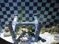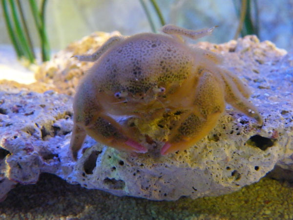 | Michael Mettler: | Erst mal ein Foto einer nicht mehr gehaltenen Art aus der Krebsausstellung: Könnte dieses nur wenige Zentimeter große Tier eine Schwammkrabbe sein? Im Mergus-Meerwasseratlas Nr. 1 fand ich eine Art Dromia personata, die mich sehr an die Krabbe bei SL erinnerte, aber als Tier kühlerer Gewässer wohl nicht in Frage kommt (Mitbewohner waren nämlich Stenopus). Auch die Bärenkrebse im selben Becken sind für mich noch unbestimmt. (11.02.2008, 16:44) | ||