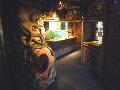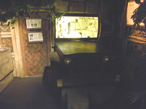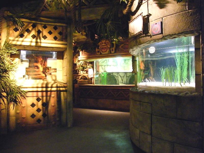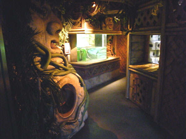 | Michael Mettler: | Die Qualität der Bilder ist zwar nicht berauschend, da der Sonderausstellungsraum sehr dunkel gehalten ist, erlaubt aber dennoch einen ungefähren Eindruck. Hier die Eingangsperspektive: Links ein Götzenbildnis mit integriertem Krabbeltunnel für Kinder, geradeaus das Seeschlangenbecken, rechts das mit einer Drachenmuräne besetzte Raumteilerbecken. (14.03.2008, 14:01) | ||