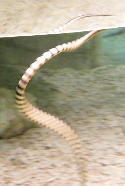 | Hongabonga: | Ich war heute im Sea Life Hannover um mir die Ausstellung anzusehen. Sie besteht aus 4 Becken. Das erste Becken befindet sich, wenn man von der Tropenhalle kommt auf der rechten Seite. Es ist von 2 gegenüberligenden Seiten aus einsehbar und beherbergt eine(?) Drachenmuräne(Enchelycore pardalis). Das nächste Becken beherbergt das Highlight, einen Nattern-Plattschwanz(Laticauda colubrina). Die Schlange nutzte die komplette Anlage, sie war auch eine ganze Zeit auf dem Landteil. Im darauf folgenen Becken trifft man auf alte Bekannte, nämlich die früher schonmal gehaltenen Karibik-Röhrenaale. Das Becken der Röhrenaale wirkt durch geschickt gestellte Spiegel größer als es eigentlich ist. Das letzte Becken wird von Zebramuränen(Gymnothorax zebra), Geistermuränen(Uropterygius concolor) und Geringelten Schlangenaalen(Myrichthys colubrinus) bewohnt. Der ganze Bereich ist Tropisch gestaltet , für kleinere Kinder gibts eine kleine Rutsche. Ich finde die Sonder-Ausstellung von der Gestaltung und von den Arten her nicht schlecht. Ansonsten hat das Zweipunktkraken-Weibchen Eier gelegt und bewacht diese jetzt. (13.03.2008, 22:23) | ||