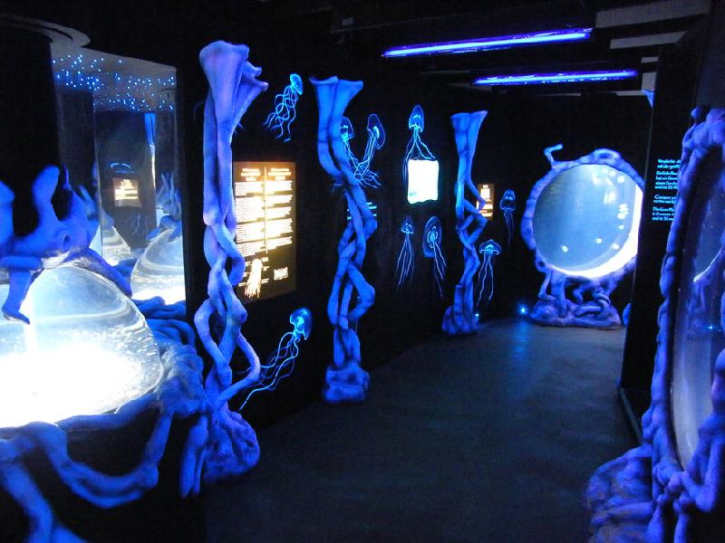 | Michael Mettler: | Von der optischen Aufmachung her finde ich die diesjährige Sonderausstellung mit Quallen recht gelungen. Durch einen Vorhang aus "Tentakeln" (transparente Gummistreifen) betritt man einen dunklen Tunnel, der mit UV-Licht ausgeleuchtet ist, so dass alle weißen Elemente blau "phosphoreszieren", was vor allem bei den an die Wand gemalten Quallen sehr interessant wirkt. Bis auf die bodenlebenden Mangrovequallen sind alle Arten (weitere vier) in den typisch runden Quallenaquarien, die mich immer an die Trommel einer Waschmaschine erinnern, untergebracht. Aus der letzten Sonderausstellung ist übrigens eins der Berührungsbecken am Standort verblieben, während der frühere Touchpool-Bereich (auf dem Rundgang nach der Meereslagune) nach wie vor mit Wandverkleidung abgeschirmt ist (und vielleicht gar nicht mehr existiert?). Auch den VW Bully mit dem Aquarium gibt es noch, der steht jetzt allerdings neben besagtem Lagunenbecken und das Aquarium ist derzeit leer. Im "etatmäßigen" Quallenbecken des Hauses sind derzeit junge Zebramuränen in einer etwas gewöhnungsbedürftigen Installation untergebracht. Zu den bemerkenswertesten Neuzugängen zählt ein Arowana in der Amazonas-Lagune - wobei ich die Haltung eines so sprunggewaltigen Fisches hinter einer den Wasserspiegel nur wenig überragenden Einfassung für etwas unfallträchtig halte. (28.08.2011, 18:22) | ||