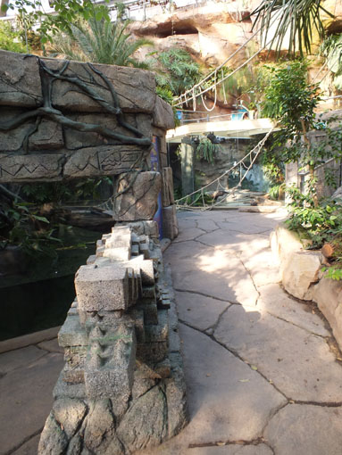 | Michael Mettler: | Die neue Krokodilanlage befindet sich auf der Fläche des früheren Bananenhains in der Tropenhalle, zwischen dem Piranha- und dem Raubwelsbecken. Entfallen ist dafür das Hochwasser-Niedrigwasser-Doppelaquarium mit Diskusfischen etc., ansonsten "nur" Pflanzbereiche. In meinen Augen wirkt die Anlage allerdings wie ein Fremdkörper in der Halle. Das Entree ist ja noch relativ stimmig, mit einer Fortsetzung der "Maya-Ruine", in der sich ein kleiner Über-und-unter-Wasser-Einblick befindet (im Foto links), und der von einer "steinernen" Krokodilstatue bewacht wird. Rechts hinten ist ein weiterer Teil der Anlage zu sehen.... (29.05.2012, 21:38) | ||