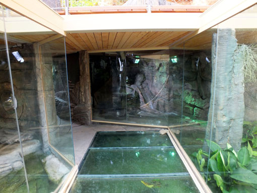 | Michael Mettler: | Und der Blick (fast) aus der Gegenrichtung. Laut Aquariumführer entstand diese Anlage "ganz im Stil kubanischer Sümpfe" - wenn es dort wirklich so aussieht, wundert es mich nicht, dass das Rautenkrokodil ausstirbt... Ich habe zwar schon deutlich nüchternere Krokodilanlagen gesehen, aber mit Ausnahme weniger Pflanzen und Baumstämme ist diese hier eine reine Kunstfelslandschaft und hat mitnichten irgendwelche Ähnlichkeit mit einem Sumpf. Das geht so weit, dass die Krokodile nicht mal eine Fläche mit weichem Substrat zum Liegen haben. (29.05.2012, 21:51) | ||