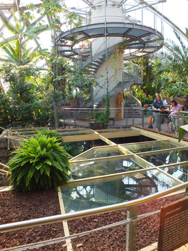 | Michael Mettler: | ...aber nach der leichten Linkskurve bietet sich dann dieser Anblick, und zumindest bei mir will dann die Illusion einer Tropenlandschaft einfach nicht mehr hinhauen. Zu sehen ist der so genannte "1. Croc-Walk Deutschlands": Den Glasboden können die Krokodile unterschwimmen, um von einem Anlagenteil in den anderen zu gelangen. Was geradeaus auf dem Bild zu sehen ist, gehört noch zum rechten Anlagenteil; dort befindet sich außer einem Pflegerzugang auch der unvermeidliche Mini-Wasserfall. Selbst wenn sich ein Kroko unter dem Glasboden befunden hätte, hätte ich es nur erahnen können, denn die Unterseite des Glases hängt voller Kondenswassertropfen, in der Oberseite spiegelt sich die Helligkeit der Tropenhalle, und der Wasserbereich darunter ist nicht etwa zusätzlich künstlich beleuchtet (zumindest nicht bei Tageslicht in der Halle). (29.05.2012, 21:45) | ||